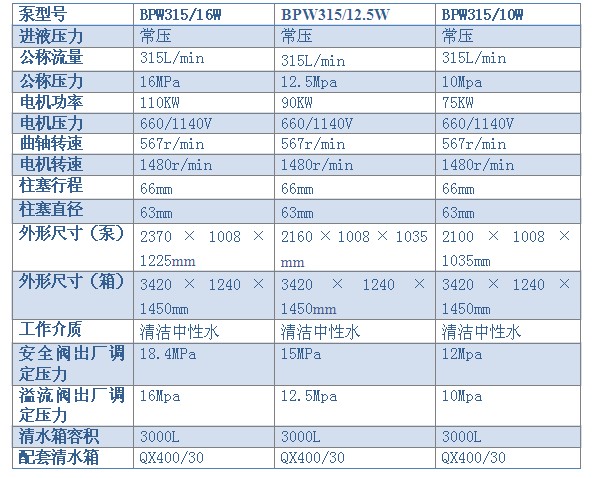 BPW315/16(12.5、10)W型喷雾泵与QX400/30清水箱组成喷雾泵站,为煤矿井下采掘工作面及其它需要喷雾泵灭尘的作业场所提供喷雾压力水。
