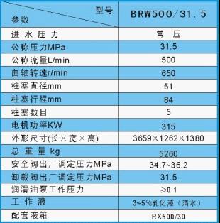 BRW500/31.5型乳化液泵与RX500/30型乳化液箱组成乳化液泵站,主要为大采高、厚煤层综合机械化采煤液压支架提供动力源,也可用于地面其它液压设备。该泵站一般由两泵一箱组成。对于高效高产工作面可以配置三泵两箱。